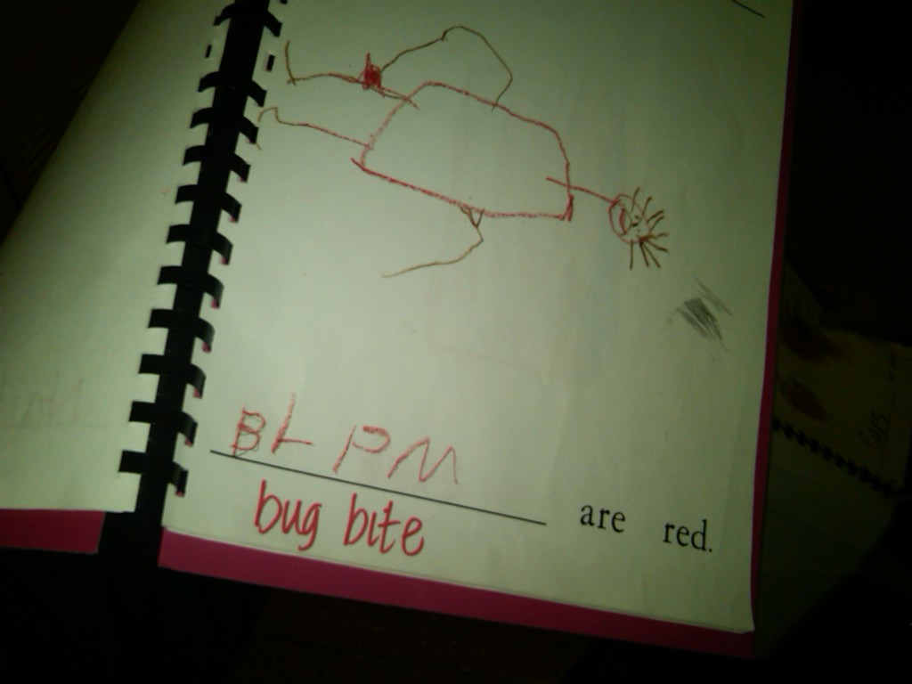 In the red folder, kids were drawing apples, stop signs, fire trucks. Â My kid drew a man down bleeding red blood from a bug bite.