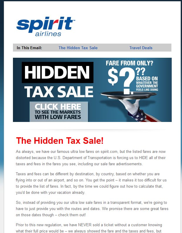 So, who's lying, Spirit Air or the federal government? Personally, I never believe the government about anything until it's been proven to be true. Most likely the government has made this rule that makes airfares show as the total including taxes to avoid surprises about how much that total will be. But in the process they probably also made it so that the taxes have to show as part of the airfare and not be itemized, so they can hide it in there and avoid a tax revolt. Because that's the sort of cheesy shit they tend to do. We have rules to protect consumers from companies, why can't we get some to protect consumers from government? Posted by GORDON on Jan. 26 2012,16:31