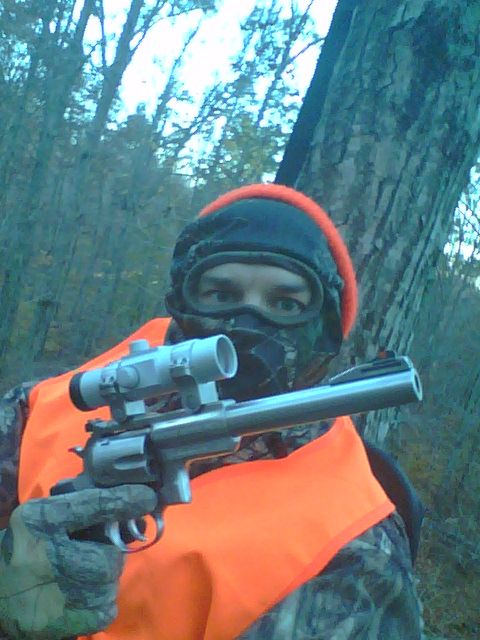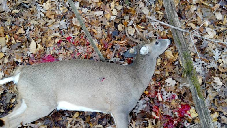 I set my alarm for 5:25am so I wouldn’t feel bad about laying there before getting out of bed.I dressed, and went to one of my deer stands. At around 7:45am a deer came up over the ridge directly in front of me. I didn’t move until he went behind some trees. Whenever his head as out of sight I’d move, to get my revolver, or pull it up, or get it in position. ![]() I had to wait until he got to a clear place to shoot, so I had a fairly small window of opportunity. Fortunately he cooperated and stopped right where I wanted him to, about 25-30 yards away. Having missed good shots before due to hesitation, I seized the opportunity and fired my revolver. He took off running, bust I couldn't see if he was hit! He ran far too, which is not a good sign. He went way down the hill, the across the creek, then I could hear him run up the hill. It sounded like he went 200 yards. I was afraid that I might have missed him. I have no magnification on the revolver, and it is shakier than a rifle. I can shoot a nice grouping on the target range, but real-world situations are different than the target practice. I checked out the kill zone and found hair and blood: ![]() What I didn’t like is that I saw white hair. The white parts of a deer are not good to hit (tail, or belly). I texted my ex-GF a photo and she said that it from the look of the blood (creamy) it was probably a lung shot, so the deer should be dead within a few minutes. I went home to change and came back out 40 minutes. Last month the leaves were still colorful and falling. The ground looked like this a month ago: ![]() There is no blood in that picture. The deer I shot last month with an arrow didn’t bleed much, which made it hard to track in the colorful ground. Today’s deer was a different story. The hand-loaded .44 magnum hollow point made the buck bleed like crazy. I texted a friend that Stevie Wonder couldn’t lose the trail: ![]() Everything read in that picture is boood. Blood on every plant it touched, blood all over the ground… easy peazy! I followed the blood down and over a creek, and up a hill. Then I saw it laying on the other side of an old log: ![]() [I field dressed it (I gutted it) then dragged it 150’ or so, to a place I could access with the ATV. Dragging a deer downhill is easy. They just slide. Getting him up the bank was a struggle, as was getting his limp/heavy body onto the ATV. ![]() I drove him home and put him in my car. My daughter and I drove to my ex-GF's house where we processed our kills, oo together we had 4 deer to process. It’s a 1:15 card ride to Frankfort, and it was a lot of work, so my daughter and I didn’t get back until a little before 9:00. My venison barely fits in the freezer. I’ll need to move some to my in-laws deep freezer eventually. Note: I don't know why there was a tuft of white hair at the site where I shot him. The bullet went in and out, through the ribs/lungs. There is no white fur in that area. It must have been loose and fell when he panicked. Posted by Paul on Sep. 08 2015,18:32