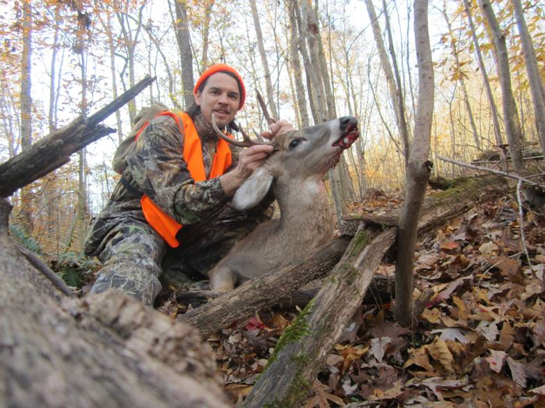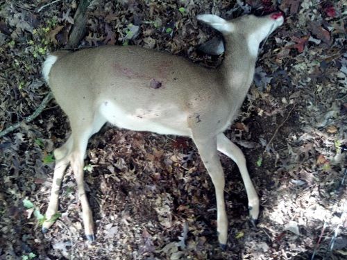No.It's not even illegal to dump piles of corn and hunt that, unless you are on public land. This was muzzleloader weekend, but I went bowhunting anyway. I had to wear hunter orange though, so I sat in the blind. ![]() I saw a ton of deer in September but during the last couple weeks there haven't been many deer. I've been told it's called the October lull. I didn't see any during my previous four hunting trips so I vowed to take the next deer to present itself. Today I seized my opportunity. She was small, but I had a good shot. My arrow pierced both lungs and I found it about 15' behind the deer. ![]() Can you guess which one went though the deer? I waited two hours before searching for the deer. There was plenty of blood at the site, but I had trouble finding any blood in the direction it ran. Can you find the blood in this picture? ![]() You can't, because there is no blood in that picture. That is autumn screwing with me. It took me three hours to find the deer. She'd run a bit under 200 yards. The first drop of blood I found was 100' away from where I shot it. I was crawling a lot of the time, trying to find blood. Eventually I found a section where it ran straight up a hill. There was blood about every 15 feet, but when it hit a clearing (and the deer could go in any direction) the blood disappeared. I probably spent an hour in that clearing but couldn't find any more blood. The last blood splatter was when it had just entered the clearing, and I noticed that one drop looked like the deer was heading right, so I went right. That eventually went into some really thick, really hairy woods, but I was frustrated so I just kept going. Then bazinga: ![]() (I found it on a log, but hauled it to clearing for this photo, and to field dress it) < field dressed it > (gore), and then took it home where I < skinned and butchered it >. I dumped the head, bones, and skin in the woods for the critters to eat.