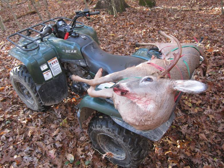 My girlfriend, her BFF, and I went deer hunting today.I was just an observer, but the women were armed. The GF and I went to a tree stand we'd set up yesterday, and the BFF hunted from the ground. After 30 minutes of waiting, a large doe came down the hill. It saw us, and then moved to another ridge to get another look at us from maybe 75 yards away. BLAMMO! The deer took off down an embankment and we lost site of it. We ran to where it was shot but didn't see blood. I went back to the stand to make sure we were searching the right location. Then my GF found a blood trail. It was a a pretty defined blood trail, and I think even my 8 year old daughter could have followed it to the body. Then she filled out some paperwork on the deer (some sort of log you have to do). It was a big fat doe. (My GF & her BFF are biologists for deer in this state, and both amazed at how much far the deer had when they processed it.) She cut the guts and butt-hole out. This was the bloodiest part. The body cavity was blood & guts soup. My friend's BFF was about 300 yards away and she said that she saw two bucks shortly after we shot ours, bit it was just a small button-buck and a 4-pointer, and she didn't want to waste her 1-buck limit on small things like that. I dragged the carcass back, maybe 400 yards, up and down gullies and such. Dragging it down hill was easy. Up hill was a bitch. I strung it up and they processed it. It's hung by the back legs, held apart. They cut around the legs and pulled the skin down, harvesting meat from various places (tenderloin, back strap, hams, etc.) I'd seen the process before on television (Kentucky Afield has a DVD out on how to do it). It was pretty neat. Posted by GORDON on Nov. 12 2011,07:07
