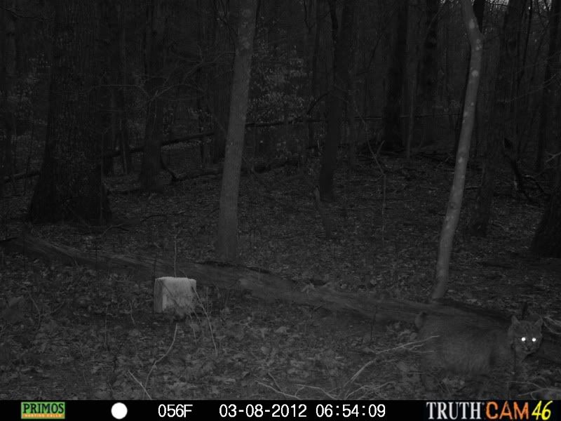 Lots of deer, lots of raccoons, lots of squirrel, some birds, the occasional possum.... then this:![]() Sweet! My daughter and I found a dead raccoon in a creek, so I used sticks as tongs to carry it up to the trail cam. Deer sniffed it, raccoons sniffed it, a possum dug into it multiple times, and I guess this bobcat came by to see what the possum had left. Posted by Paul on Apr. 22 2012,16:39