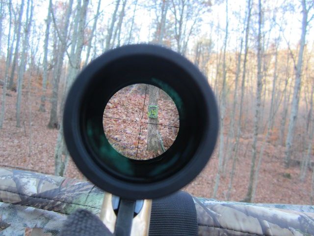 While bow hunting yesterday I could have bagged a doe. Three presented excellent shots, but I wanted the buck I'd seen the morning before to show up. He didn't.This morning my daughter and I got up just before sunrise and hit the tree stand. ![]() She got bored and went home after an hour. I stayed out a couple hours longer but didn't see anything. I still want that buck. Even if the does came back I'd have left them alone. ![]() I'm aiming toward the trail cam: ![]() The cam through the scope: