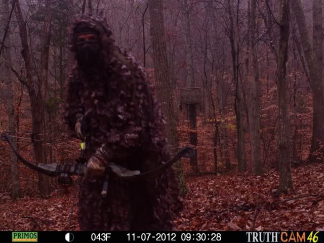 I went bow hunting this morning but didn't see any deer.I went out early, so the infrared lights of the trail cam kicked on, making me look evil: ![]() (That's me in both pics.) I spent awhile hunkered against a tree and was visited several times by a chipmunk on a log. Before I left I put my camera on that log to take a pic of myself. ![]() I ended up moving to another location at one point and the trail cam caught me again. I look less evil in this photo: ![]() I plan on going back out tomorrow after I drop my daughter at school. Posted by GORDON on Nov. 07 2012,18:05