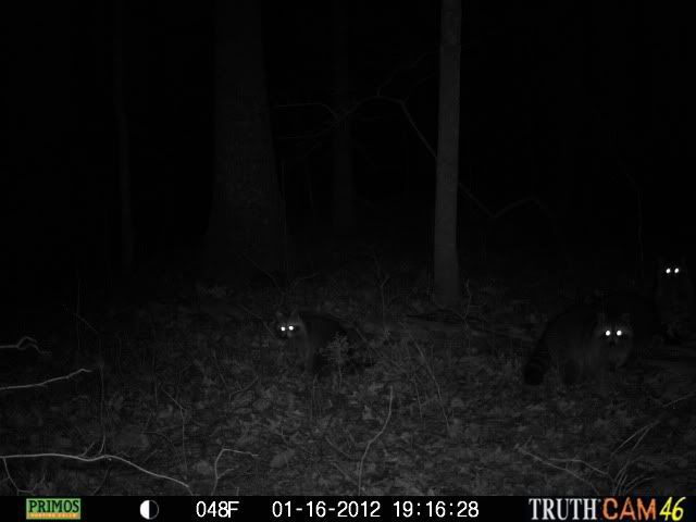 Last night a solo doe showed up.![]() Then some banditos show up. ![]() ![]() At a quarter after eight this morning there were two does. At 9:00 my dog investigated the area. At 13:60 four does showed up in the rain (blurry pics) and stayed for about 30 minutes. I'm having a blast with this camera. There was still corn out there so I didn't add any more today, but I did ad a salt block and I put some sort of block topper on it (a powder and a molasses-like topping) to see if I can get the critters to dig into that. I still haven't seen a buck on the camera yet. I'd really like to see some turkey though. The reason I picked this spot for the camera was because we heard a turkey in that area, and saw where turkey had turned over a bunch of leaves. Posted by GORDON on Jan. 17 2012,16:51