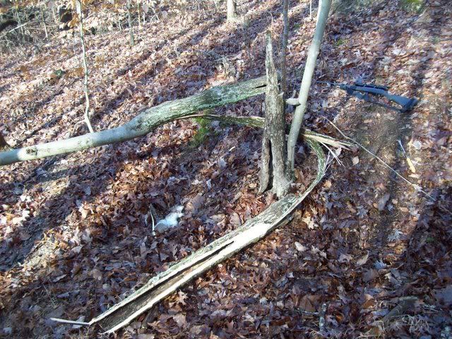 Shot one in one shoulder.I thought it was doing a death crawl so I figured I'd let it bleed out as it crawled down a ravine. Then it went into the base of a small tree. What I didn't know what that the tree was hollow. I hiked home, but my old chainsaw wouldn't start and my good one is at my in-law's place, so I grabbed a hand saw and went to work cutting about 18" up (I figured it was only hollow for about 3'). Boy was I wrong. Once I cut it and pushed the tree over, I rammed a 5' branch up the hole, and hit nothing. Ugh. I sawed through it again, and snapped it over the stump, which peeled a lot of it. ![]() That bit in the foreground is the middle chunk I cut out. The squirrel stayed in the top part of the tree (there's a hole there). I couldn't push him out with a stick. He just squealed in protest and dug in with his claws. I was able to get a view of his head so I pointed the gun at point blank range and fired to brain the little bastard, but he moved so I only took a chunk out above his left eye. I was sweating from all the sawing so I finally just jammed the gun up and pointed at his vitals... blammo! That did it. ![]() 3 shots to kill that mofo. Then I followed some Internet directions to skin and disembowel it because I planned on making a squirrel stew. Unfortunately I totally butchered the job. The thing was a mess. I cut too deep, tore too much, and got fur everywhere. I felt guilty about wasting the meat, but I ended up just chucking it in the woods. Posted by thibodeaux on Dec. 24 2011,09:14
