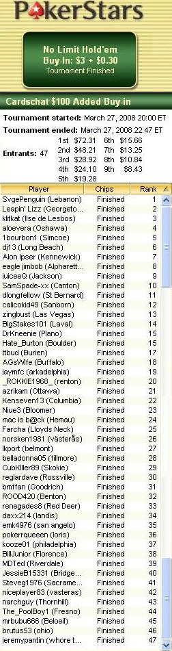 Skipped a live game tonight (lost $10 there last time) and hit a tournament sponsored by a poker forum I frequent.Things turned out well. ![]() Posted by TPRJones on Mar. 28 2008,06:55