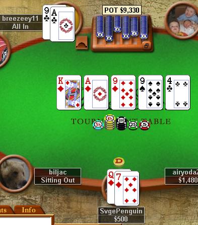 I quit playing tournaments and just play the tables. despite my friend's warning that it was hard to get money in those games I have found them to be really profitable. It took me four days (maybe 10 hours?) to turn my $1k into $100k.I play with two accounts. Once I hit 103k with my "Spenguin" account I started building up my "SavagePenguin" account. I was having some incredibly bad luck. I hit a lucky streak just before quitting my last game where I went all-in pre-flop 4 hands in a row and came out with 28k. It really pissed some people off. The first hand I had junk (4/8 that made two pair, but the second hand I had a pocket pair, and hands 3 & 4 had aces with paint kickers. The next hand I was dealt crap so I quit. ************* On Saturday I played poker at a friend's house (the guy who ran the $25 tournament April 7... see post #2). There were 13 players total. I'd only played with two of them before, so most players were a mystery. Thirteen is a weird number of players, so we broke the game into two tables, and combined them when there were 9 or so left. Game 1: I was the 3rd or 4th person knocked out of the first game. I had pocket aces against a ten high flop, and was up against someone I considered to be lousy. I got him to put a lot of chips in pre-flop, on the flop and on the turn (that put two clubs on the board) so we were both pot committed with the third club hit on the river... giving him the flush he had been chasing. No pair, no straight draw, just a flush. Game 2: In the second game on *monster* pot had several people all-in. The woman to my right won it. If I could pick one person to win it (since I wasn't in it) it'd be her. I figured I'd be taking my share of those chips. She ended up knocking several more people out due to lucky cards. Every time someone had an pocket A/A or K/K they lost. EVERY TIME THAT NIGHT. Eventually it came down to her, myself and another girl. I had two big blinds, and the girl to my left had 1.5 big blinds. At this point I wanted to get second (because we only paid 1st and 2nd) so I pretty much sat on my hands. We both ended up winning an all-in hand against the chip leader, but she went out first, locking me into a payoff position. That win paid for my expenses that night. I had a Queen/rag on the next hand, and with only a big blind left I went all-in. The chip leader called with a Jack/rag, and hit a second Jack to beat me. Game 3: Game three I was dealt K/K early on. There was a lousy flop 8/6/4 rainbow. I was hoping for a Q/J/2 or something like that. The only guy to play against me was the guy who took me out when I had A/A that first game. He was sitting on my right, so I was pleased to have position on him. He ended up going runner-runner for a straight, crushing my kings. I only let him take half of my chips though. When I showed my hand the table my cowboys they told me I was stupid for playing K/K because top pairs were cursed. Someone got knocked out and I moved to their chair (same position though) to make dealing easier. This put me across from my nemesis. Now, the entire night he kept hurting me. He'd suck out and win, or he'd bet too much and I'd fold. He though he had me dominated, and I kept encouraging his perception by praising his superior play and letting him know how afraid of him I was. Basically, I was setting him up for a big fall. Now that I was sitting across from him I could observe his mannerisms a bit more and I picked up a tell. He had a classic "I missed that hand" tell. The next time we went up against each other he exhibited this tell. I had second pair so I pushed back. He pushed back again, and I went all-in. He called and I doubled up. A few hands later that scenario repeated itself. A few hands later it happened again, and I took all of his chips. When it came down to the final two players I had about a 3/1 chip lead. It was after 1:00am and the host had fallen asleep on the sofa so I offered to split the pot with my opponent (my best friend, who's not quite as good as me, and who was my driver that night). He agreed. It was about an hour's drive back home so I didn't get in until after 2:00am. I had a blast. The last big game I'd played in was that $25 game in April. I'd played a bunch of small, 6 person games since then (winning about half of them... at one point I won 6 in a row). Anyway, there will be another game with about 10 players on St. Patrick's Day that I plan on hitting. I can't wait. I guess the annual big April tournament is around the corner as well. Posted by TPRJones on Mar. 02 2007,11:04