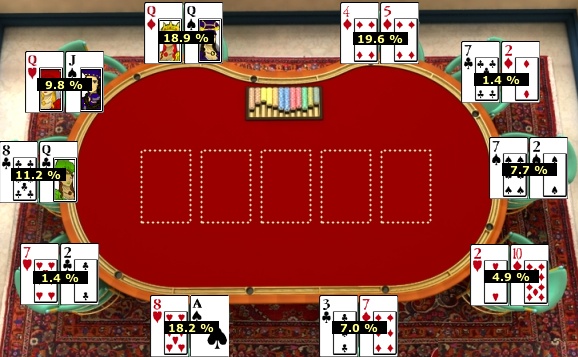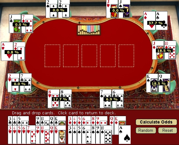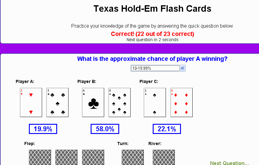 (Paul @ Jun. 04 2007,13:50) QUOTE < http://texas-holdem-lingo.com/flashcards.php > A neat little poker tool. I'm almost always within 2% of estimating the odds, but it seems that the odds always fall within a percentage point of the choices. ![]() This was the toughest question yet. I only got it because I got lucky. I think I estimated "about 20%" and just got lucky picking the low side. I'm usually about 80% in getting these questions right, as I try not to dwell on them too much and when you have to answer a specific question about the odds against two other hands, it can be tricky. Posted by TPRJones on Jun. 21 2007,09:49