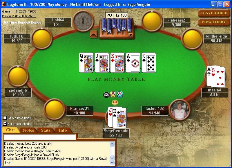 Yahoo has free games. don't know if we can make it private though. Doing the free play could be more fun in the sense that we could do a 10 to 1 kind of thing so our pots can be bigger. In other words, everyone starts with $1000 in fake money and we all put up $10.And honestly, I'd rather keep it in the $10 range. Ya, I know you'd rather take my $20, but, I don't want to give you that much. If I'm going to spend $20 to play a game, it won't be one in which I just hand you guys $20. We could also do a free play thing where we all start with the same amount of money, then play whenever, against whoever. After two weeks, who ever has the most money claims the paypal prize. We use to do something like that with the stock market. We'd all invest and after 2 weeks, whoever had the most money won. This way, as I learn, I may have a chance to catch up and be competative. Otherwise, I'm out in 10-20 minutes and I didn't learn anything and I don't want to play any more cause losing sucks. Posted by Paul on Jan. 03 2010,20:20