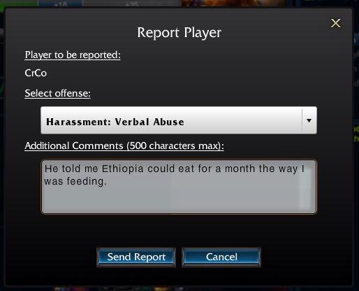From a tribunal report where the reported player was talking trash:QUOTE Reported: my ***** is so big that he goes to A from Z in the key board Now look at your keyboard... P.S. If we're going to continue to do draft mode, we need to create a list of champs we want banned. My list right now would be: Rammus Morgana Ziggs Posted by Cakedaddy on Mar. 07 2012,10:03
