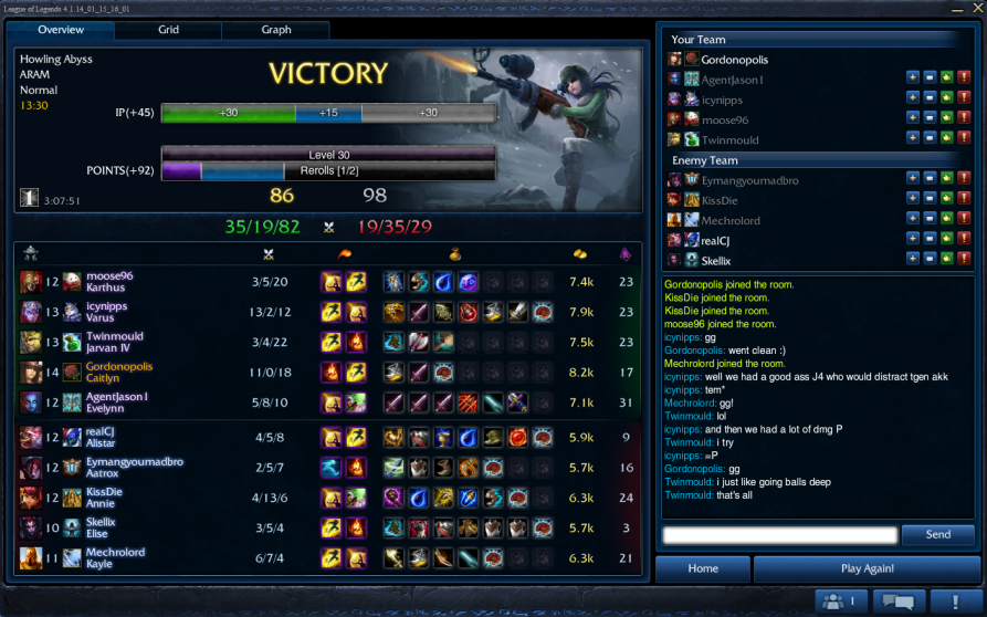 QUOTE On Facebook she wrote "Thanks everyone! I had a yummy lunch with (Leisher) and the twins and then went shopping all by myself!" I was soooo tempted to comment, "So I heard you got a birthday shag." That would have been so funny. I would have laughed. She might not have. Chicks have no sense of humor. QUOTE As far as draft mode. Gordon said he didn't like it because we weren't doing well in it. I said that it was because we were playing like shit. Last night I also said we need to get out of draft mode. I believe it's both a combination of no teamwork, and people not being familiar with their other champs. QUOTE However, it did point out one major weakness. Some of us are WAY out of practice on our secondary champs. We've been playing for 500 instead of building a team. Agreed, and some of us don't even know who our "5" are... I'm one of them. Anyway, I think we can address all this stuff, but we need to do it wisely. More on that in a minute. QUOTE Ronnie says we have to pick a role and master it. He's going to be the jungler, I would be the tank, Leisher would carry, etc. Then, we only play characters that fit in that role. I disagree because we aren't always on at the same time. When he's not around, I jungle, etc. Plus, although I like to be competitive, I also consider myself a casual player and don't want this to be my job. I like playing different characters and roles. But, if the team decides we should be role specific, I'm all for it. But, I would also request that the team picks your role instead of you. He has his games. . . but more often than not, he's just adequate. He jungles about as good as I Brand. Very inconsistent. Not doing a good job, but better than having an AFK. I have no idea where you guys would put me. I think I play Noc WAY better than Ashe, but you guys are always asking for Ashe. I think I do pretty good as Maokai, but Leisher has implied he's seen better. . . So, I have no idea where you'd put me. I think Ronnie has a point. Last night I moved from AD Carry to Tank, and suffered for it. I tried to aggressively push my lane, I don't think I led out far enough in team fights. Had I been playing another AD Carry or even Teemo, it would have been a far different experience. My gameplay could have remained the same. However, none of us want to be shoehorned into a category. I love AD Carry, but sometimes it's fun to move into another role. (Although, if you guys wanted me to, I'd do it. I could easily make my five: MF, Trynd, Graves, Wukong, and Fiora.) What category does Singed fall into? He's a whole different playstyle. Scooty would never fall into one category. Cake's characters are AD, tanks, and AP. I'd only go this route if everybody said let's do it. And I didn't say I've seen better Maokai, I said I wasn't nuts about the character. I think other tanks have much better "circles" like Amumu. You play Maokai well. Anyway, I think we should move to normal games, most of us stick with what we know while one...maybe two...do something different. Make that our status quo for a while, then change it up again. We go for wins, we work on teamwork, we learn new champs, and most importantly, we have fun. Plus, next time we enter draft mode, we need more than one of us to own critical champs. Singed needs to be grabbed early so the opponents don't take him. In that example, Gordon would also need to own Miss Fortune, if say, I took Singed for him. Posted by GORDON on Mar. 10 2012,11:06
