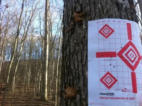 We had targets placed a 20 yards (on a wood pile), 25 yards, 50 yards, and 75 yards. Â We couldn't go back any farther because we were shooting in the the woods and there was no clear path. It was pretty cold out and the wind was blowing from right to left.