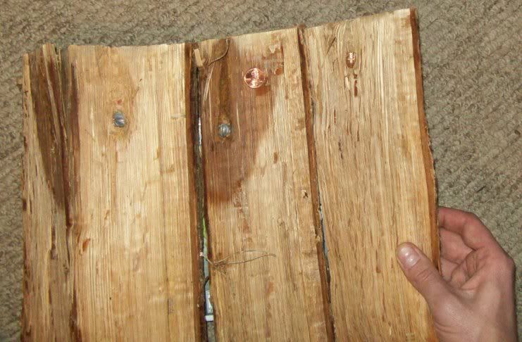 I split open one of the logs from the wood pile that we shot at: The one on the left is the .50 muzzle loader shooting a 300 grain sabot. The one in the middle is the .44 Henry shooting a 240 grain jacketed soft point. The one on the right is the Ruger LCP (.380) shooting a 90 grain full metal jacket.