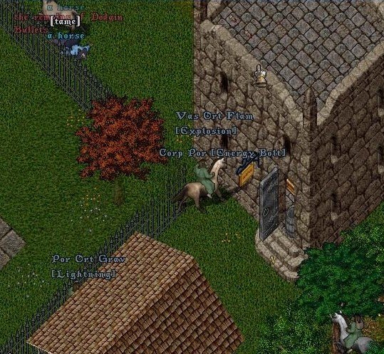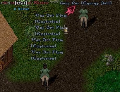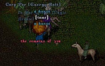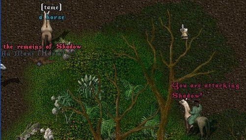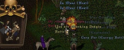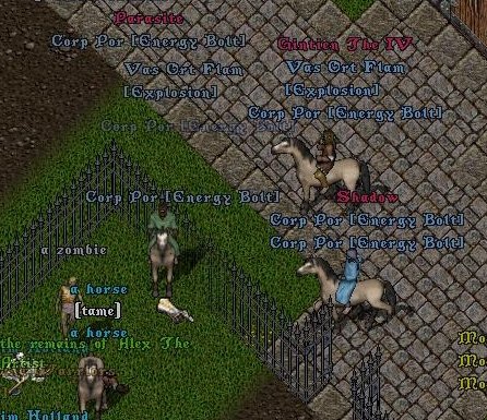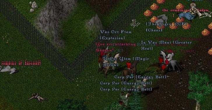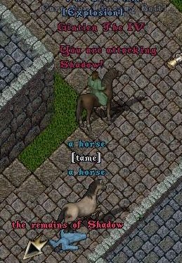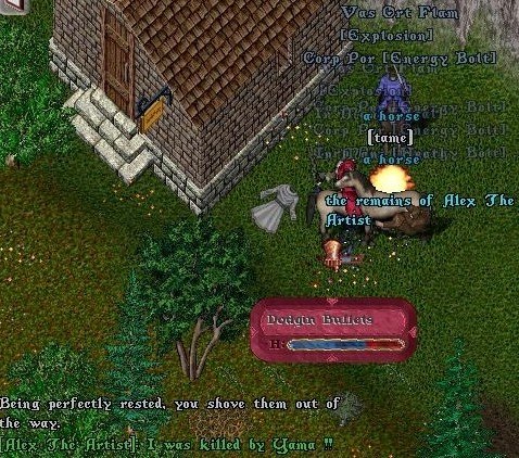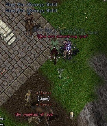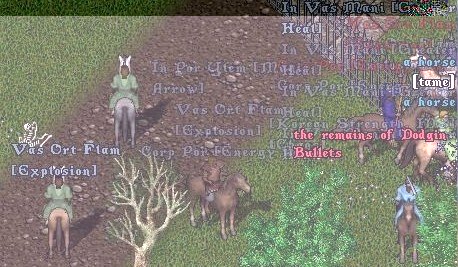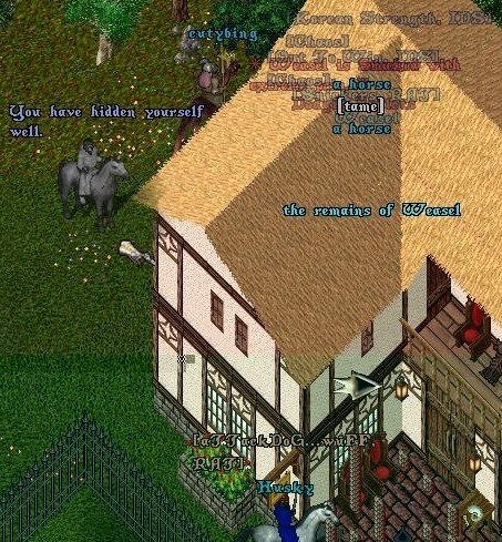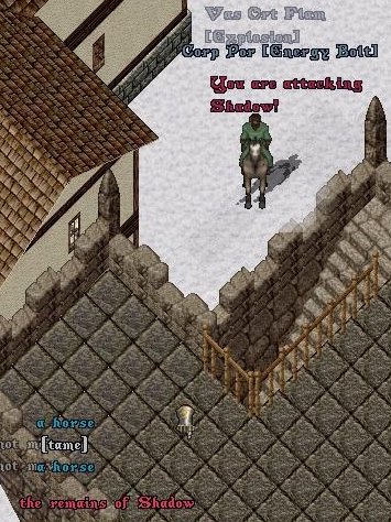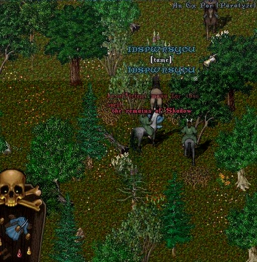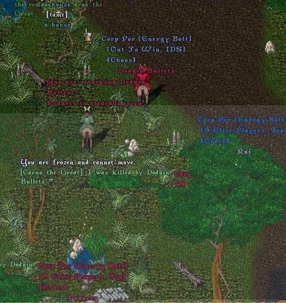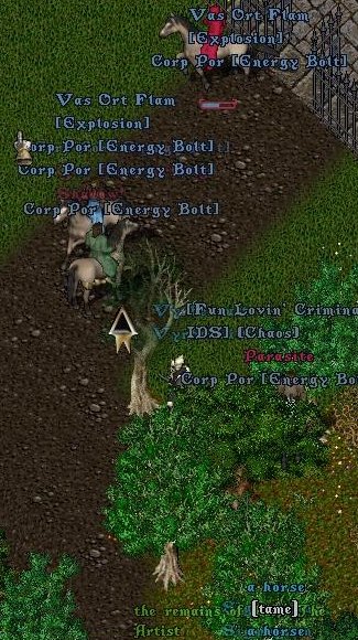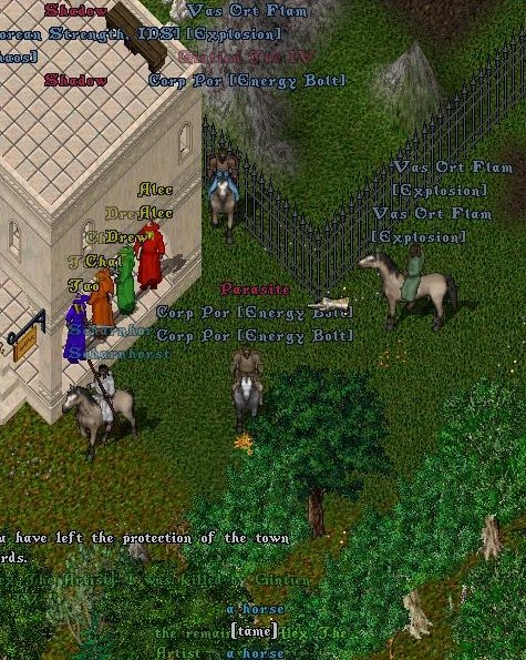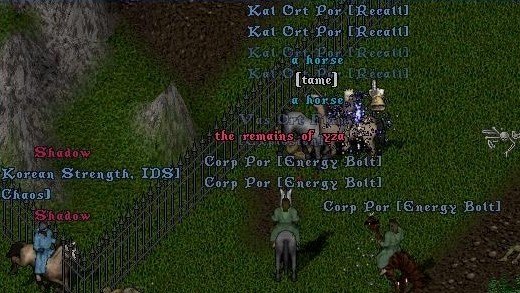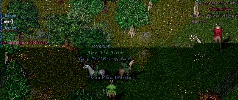 Since the IDS Spawn, there hadn't been any large scale TKV/IDS combat, just random encounters here and there. Most of the time we would encounter a single red IDS member fighting alongside one or more reds belonging to different guilds, and I was at a loss as how to count those kills and deaths that weren't purely guild warfare. I got with GORDON and we decided that to make the calculations fair we should count a kill as a kill, and a death as a death, no matter how many other people helped. So, that's what I'm doing. GORDON sent me the pics in no particular order, so here they are in no particular order. DB getting jumped at the Brit graveyard. Don't remember the circumstances. YZA getting jumped at the Brit graveyard. Don't remember the circumstances. I remember this one. Six reds at the entrance to the graveyard, and three TKV flanked it and separated DB from his backup. He was, no doubt, running to hide in his house up on the corner. Don't remember the circumstances. Here's my death to report... DB and Yama both dumped and hally wacked me. Oh well, it has to happen occasionally. Don't remember the circumstances. Don't remember the circumstances. Hey look, more house hiding. *shock* Don't remember the circumstances. Don't remember the circumstances. I remember this one. Three TKV were in Buc's trying to tangle with three reds and a blue, Rai, who went aggressive on us. Carno dropped. Don't remember the circumstances. Don't remember the circumstances. Here's two TKV fighting three reds, which rumor has it we never do. Don't remember the circumstances. Don't remember the circumstances. GORDON reports he has two more kills to give to DB. One when he was fighting DB and another red 2v1 in Buc's. He dropped the other red, and DB got in a perfect exp/hally/ebolt combo, and killed him instantly. The second time was in the graveyard, when he was chasing DB, and another blue jumped in and PK'd GORDON. Eowyn also reports getting killed by DB once. So, the count for this update looks like 13 IDS kills, and 5 TKV deaths. - Alex the Artist
