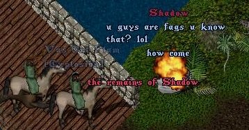 We'd noticed a couple of former IDS guys running around with different guild titles, but didn't think much of it, as people jumping ship to no longer be warring us is pretty common. But, I saw "Shadow" today without the IDS guild tag, and checked our guild stone. No IDS in the war list. I went to where the IDS stone was located, and it wasn't there. They quit. They lose. We win. Dodgin Bullits is a moron. He goes near the top of the "Most Delusional Players I've Ever Encountered" list. Top three. - Alex the Artist |
