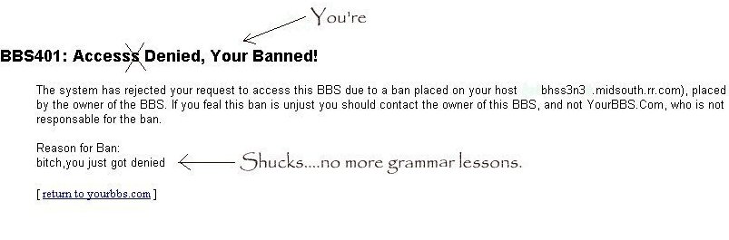 On their message board, I was pointing out basic flaws in their logic...calling them on blatant lies and mistruths...and correcting a lot of mispelled words on their part. I was banned from the board....I'm thinking they didn't like the English lessons. But, I've gotta be me....so the following pic is me correcting their grammar on the 'banned' screen that I get.