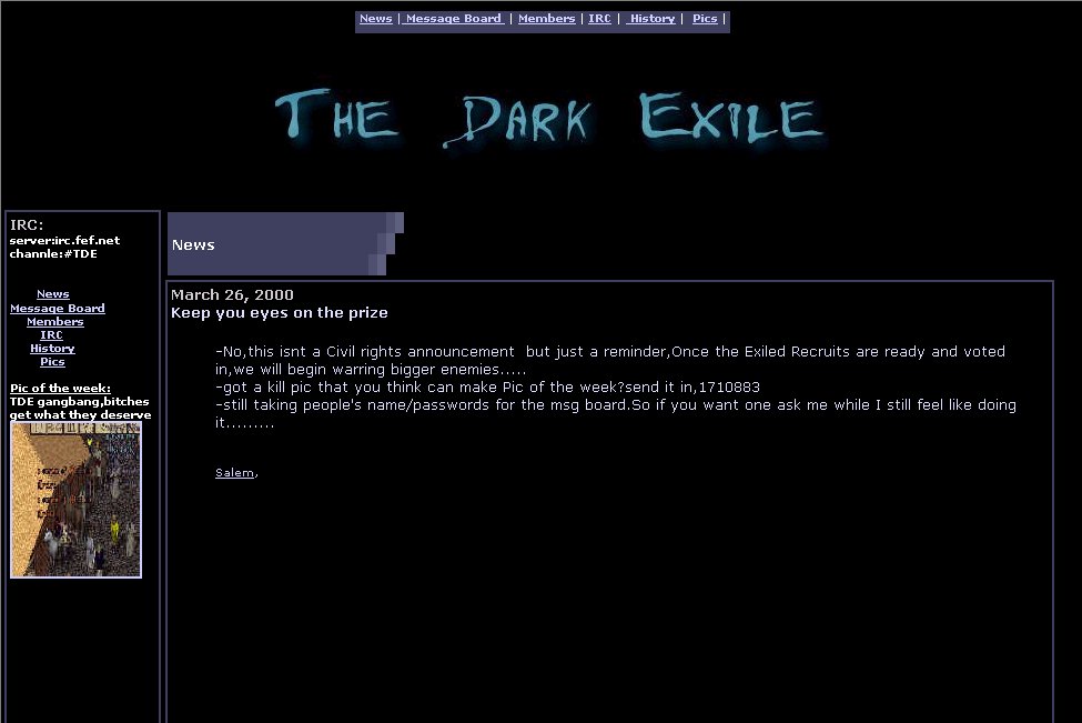 TDE...The Damp Exile.....are our current enemies in UO. They started their own cute little webpage, about 8 months after we started ours....with almost the sole purpose of payback. You see....we were posting hundreds of screenshots of dead TDE members. And they had killed us...maybe....20 times, total. So, all they have left is to talk trash, and do their best to embelish the truth....because for them, the truth aint pretty.